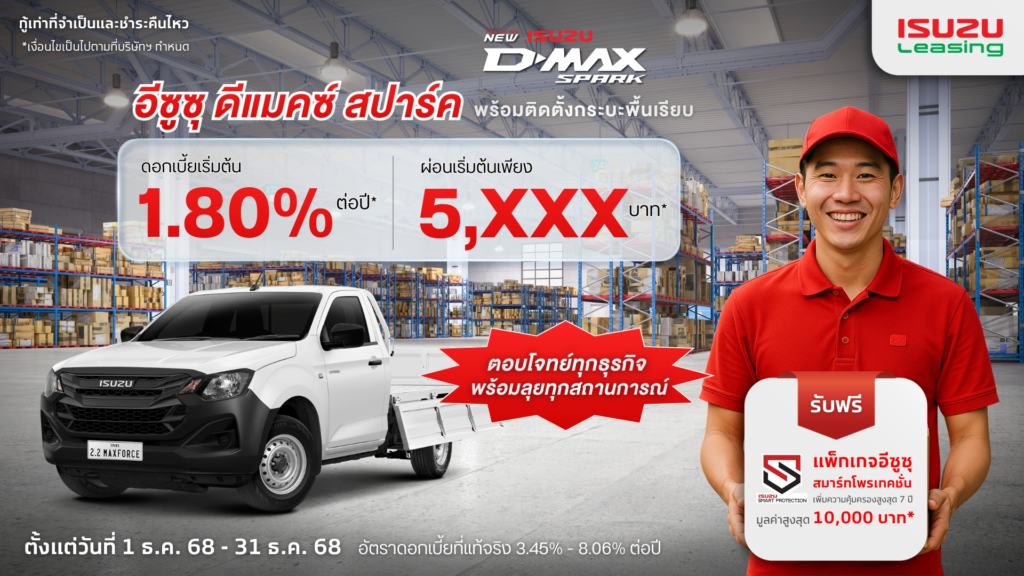 1) สำหรับลูกค้าที่ทำสัญญาเช่าซื้อรถ อีซูซุดีแมคซ์สปาร์ค พร้อมติดตั้งกระบะพื้นเรียบ* ตั้งเเต่วันที่ 1 ธ.ค. 68 – 31 ธ.ค. 68 (อ้างอิงอัตราดอกเบี้ย ณ เดือน 1 ธ.ค. 68 – 31 ธ.ค. 68)